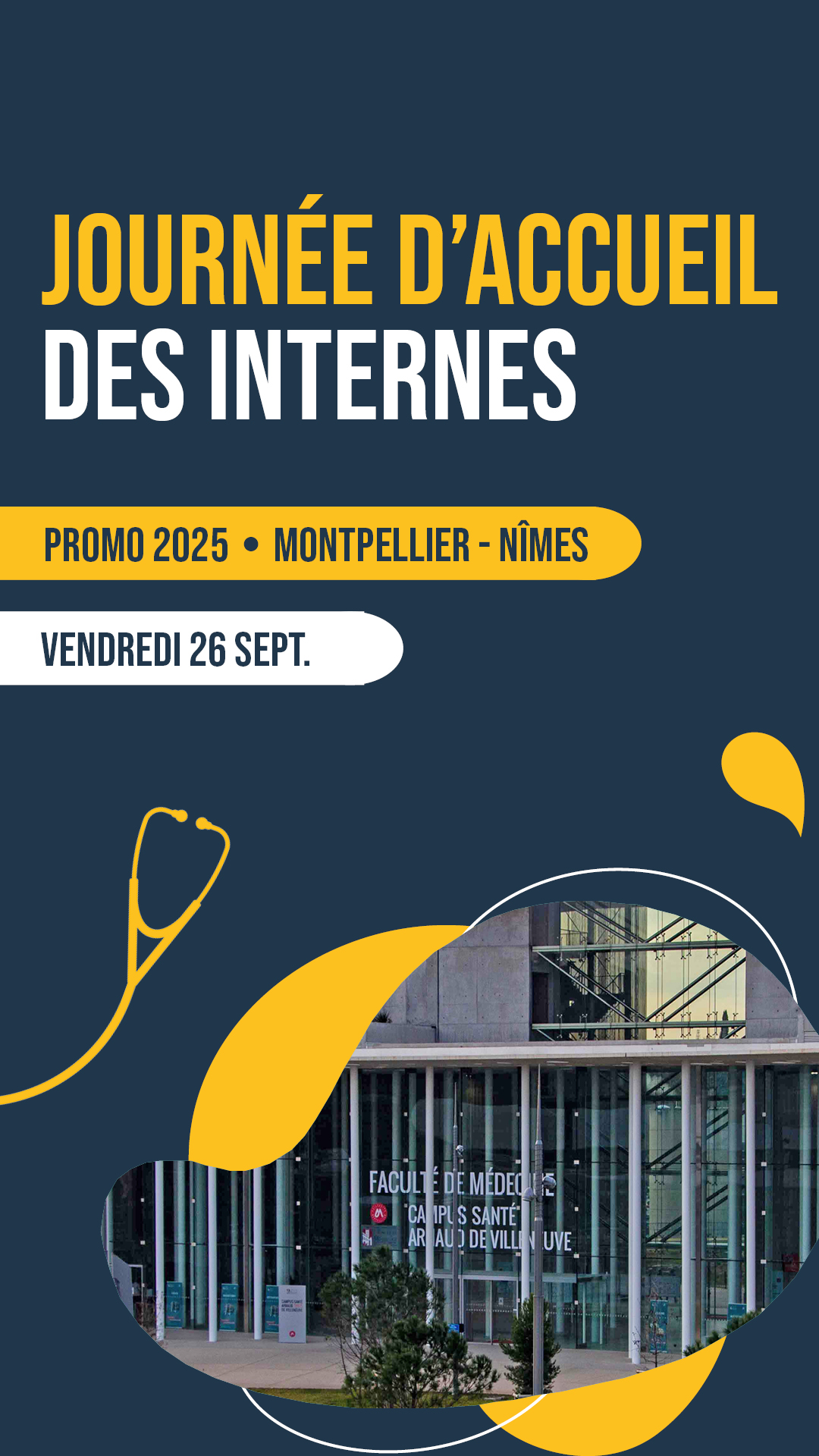La journée d’accueil des nouveaux internes de la promotion 2025 se déroulera le vendredi 26 septembre 2025 à la Faculté de Médecine de Montpellier (641 avenue du Doyen Gaston Giraud, 34090 Montpellier – Tram ligne 1, arrêt Occitanie).
